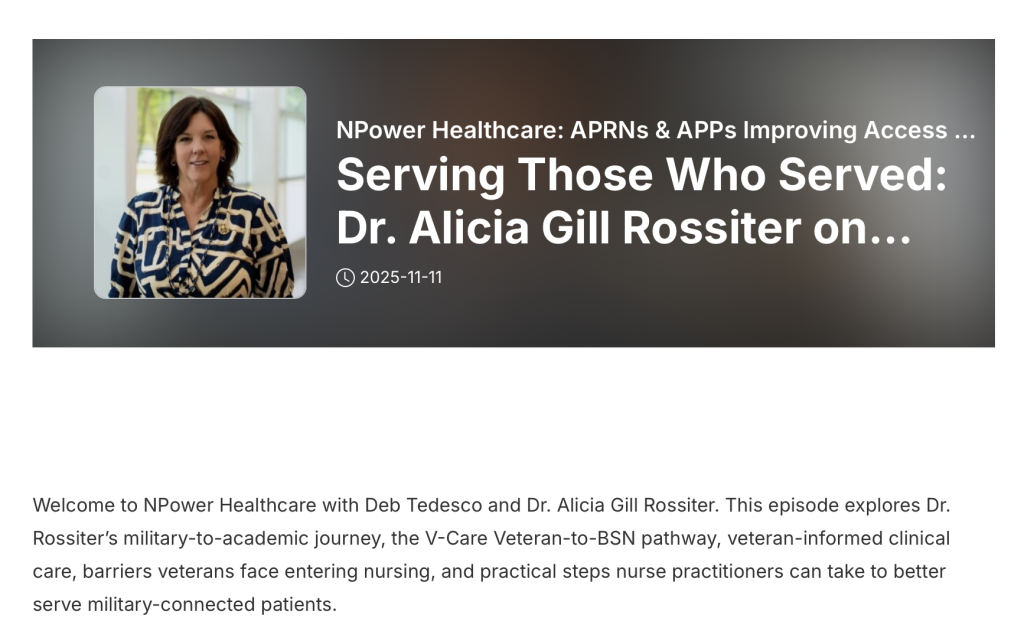 Welcome to NPower Healthcare with Deb Tedesco and Dr. Alicia Gill Rossiter. This episode explores Dr. Rossiter’s military-to-academic journey, the V‑Care Veteran-to‑BSN pathway, veteran-informed clinical care, barriers veterans face entering nursing, and practical steps nurse practitioners can take to better serve military-connected patients.